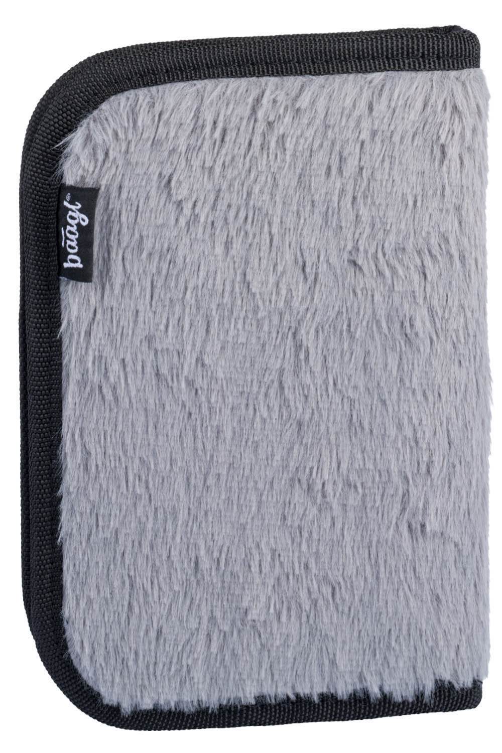 Szary pluszowy piórnik z dwoma klapkami i obrazkiem uroczej pandy.