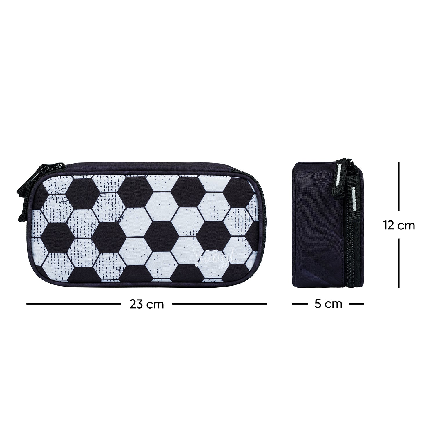 Pojemny piórnik z motywem piłkarskim. Wykonany z materiału pochodzącego z recyklingu, zawiera główną komorę oraz rozkładaną kieszonkę z przegródką i gumkami na ołówki oraz inne przybory do pisania.