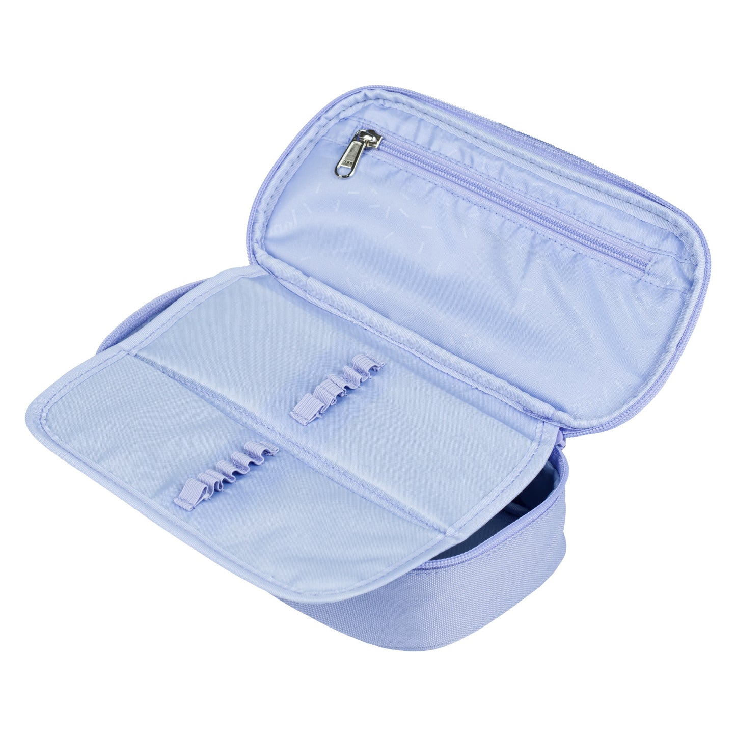 Pojemny piórnik w kolorze lila z logo BAAGL. Wykonany z materiału z recyklingu, wyposażony w główną komorę oraz rozkładaną kieszonkę z przegródką i gumkami na ołówki oraz inne przybory do pisania.