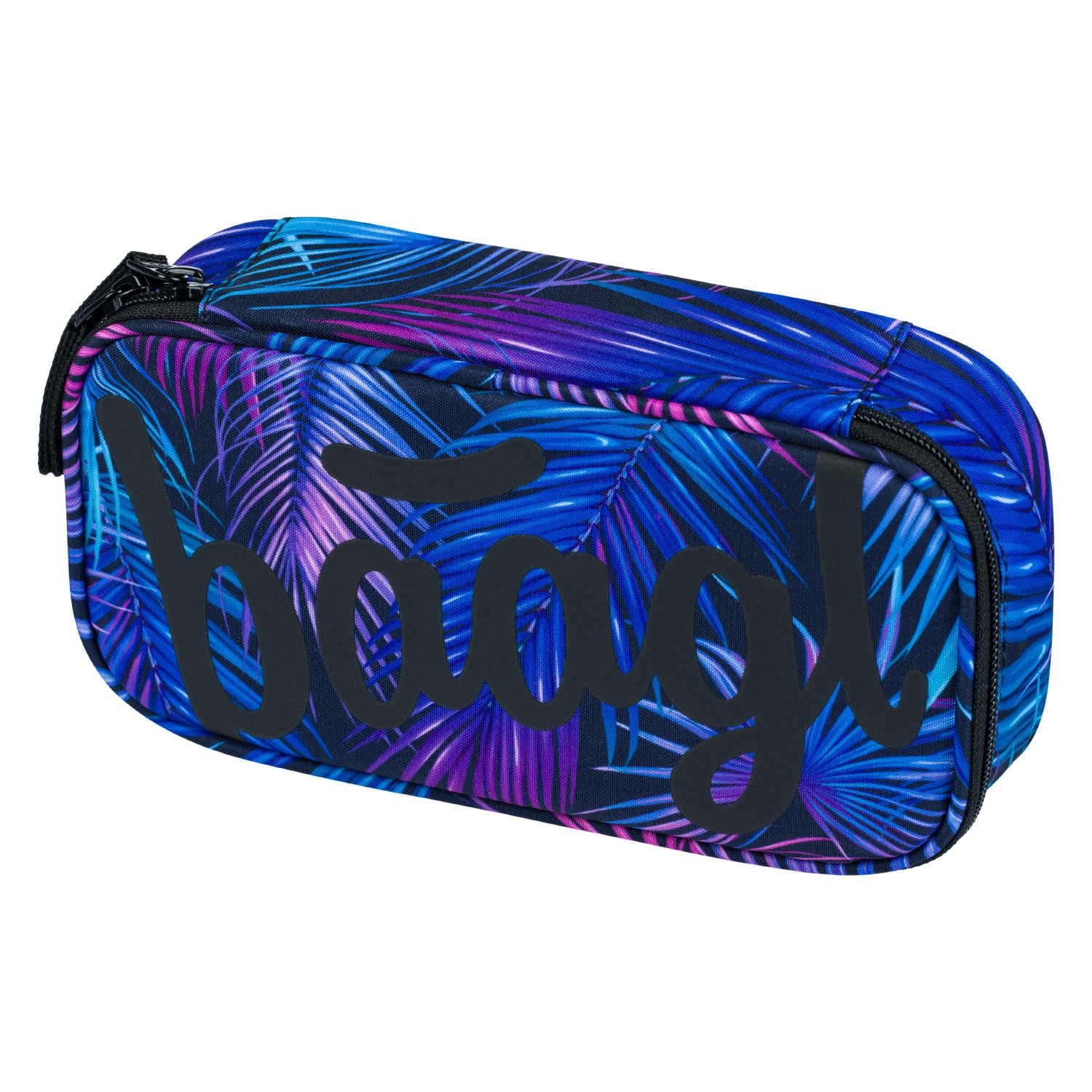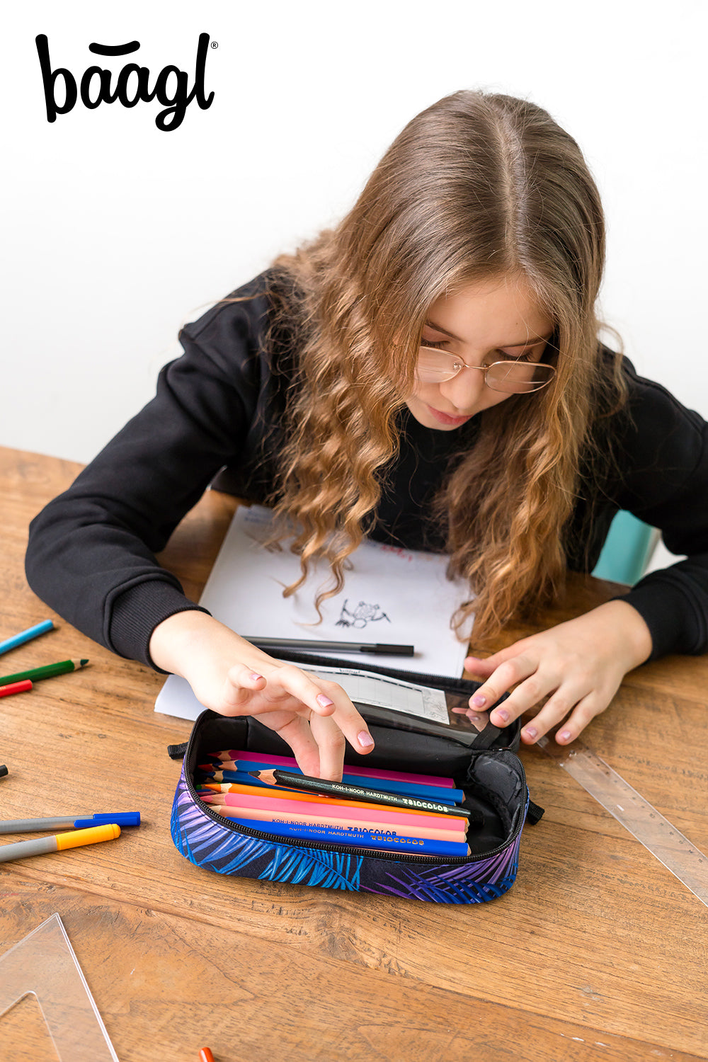 Pojemny piórnik z motywem liści i logo BAAGL. Wewnątrz znajduje się główna komora oraz rozkładana kieszonka z przegródką i gumkami na ołówki oraz inne przybory do pisania.