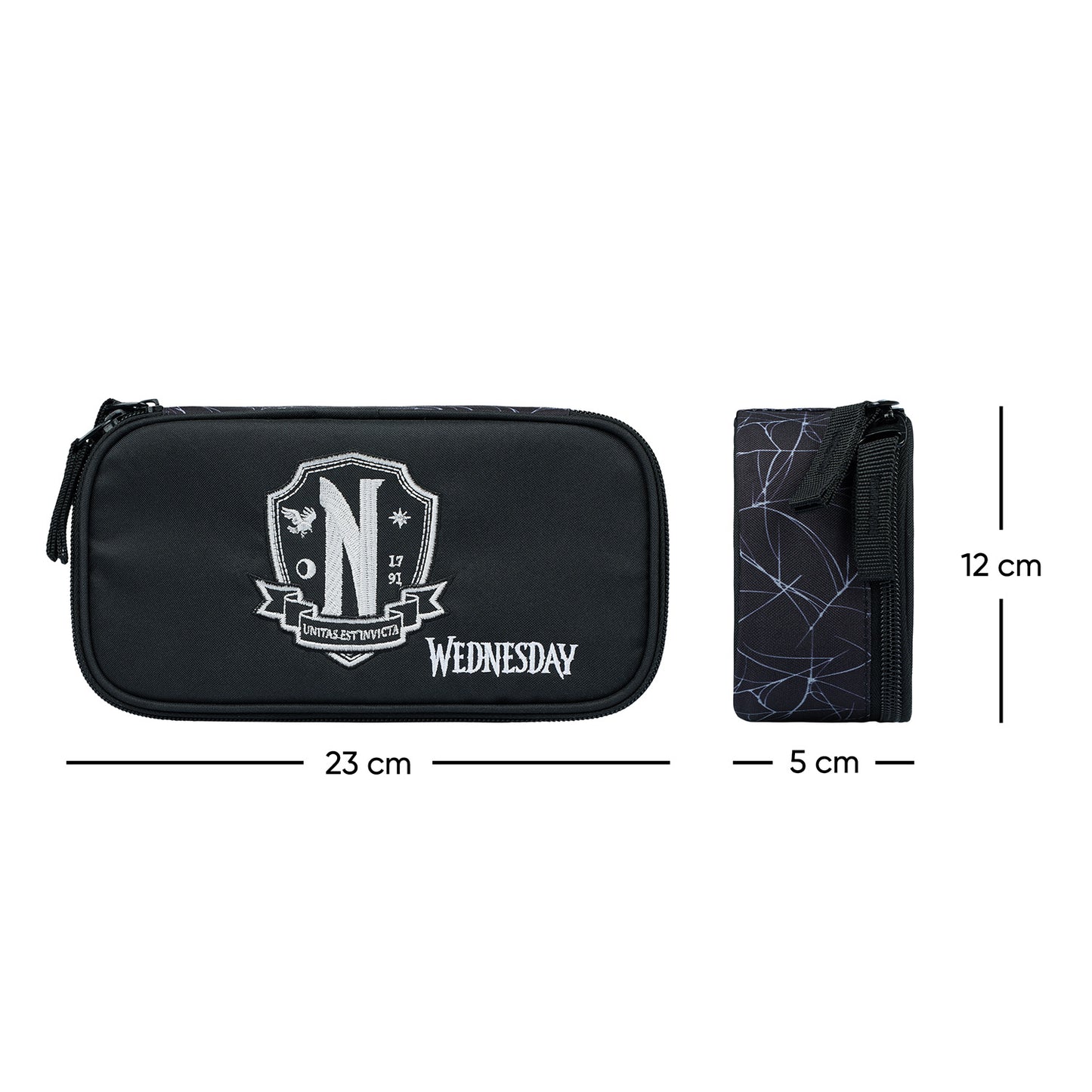 Szkolny piórnik typu etui z unikatowym motywem popularnego amerykańskiego serialu "Wednesday". W skład piórnika wchodzi główna kieszeń oraz kieszonka z przegródką i gumkami na ołówki oraz inne przybory do pisania.