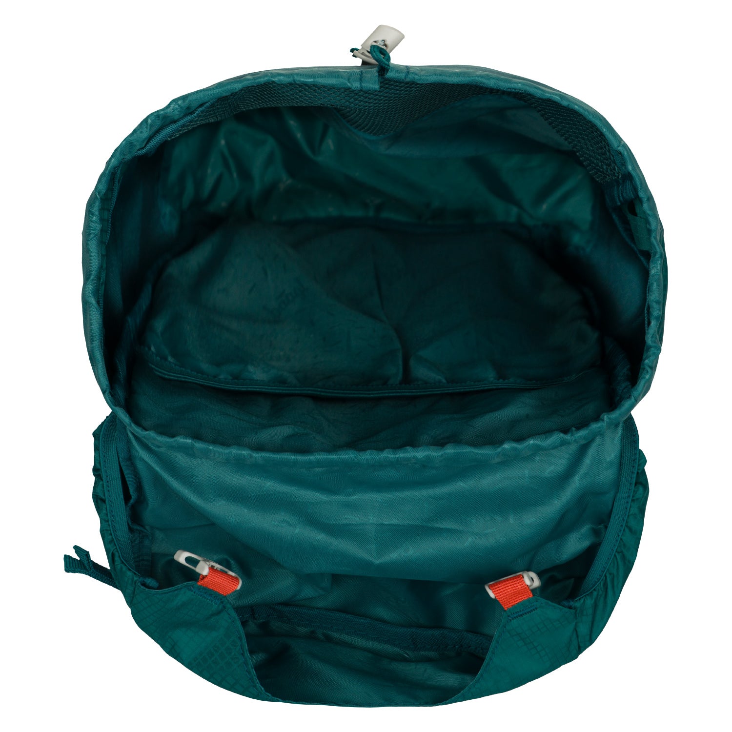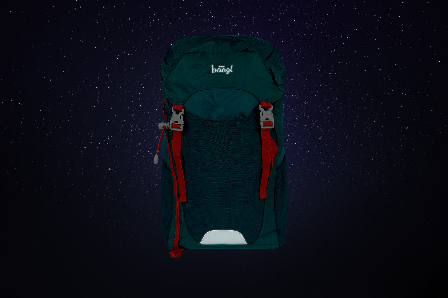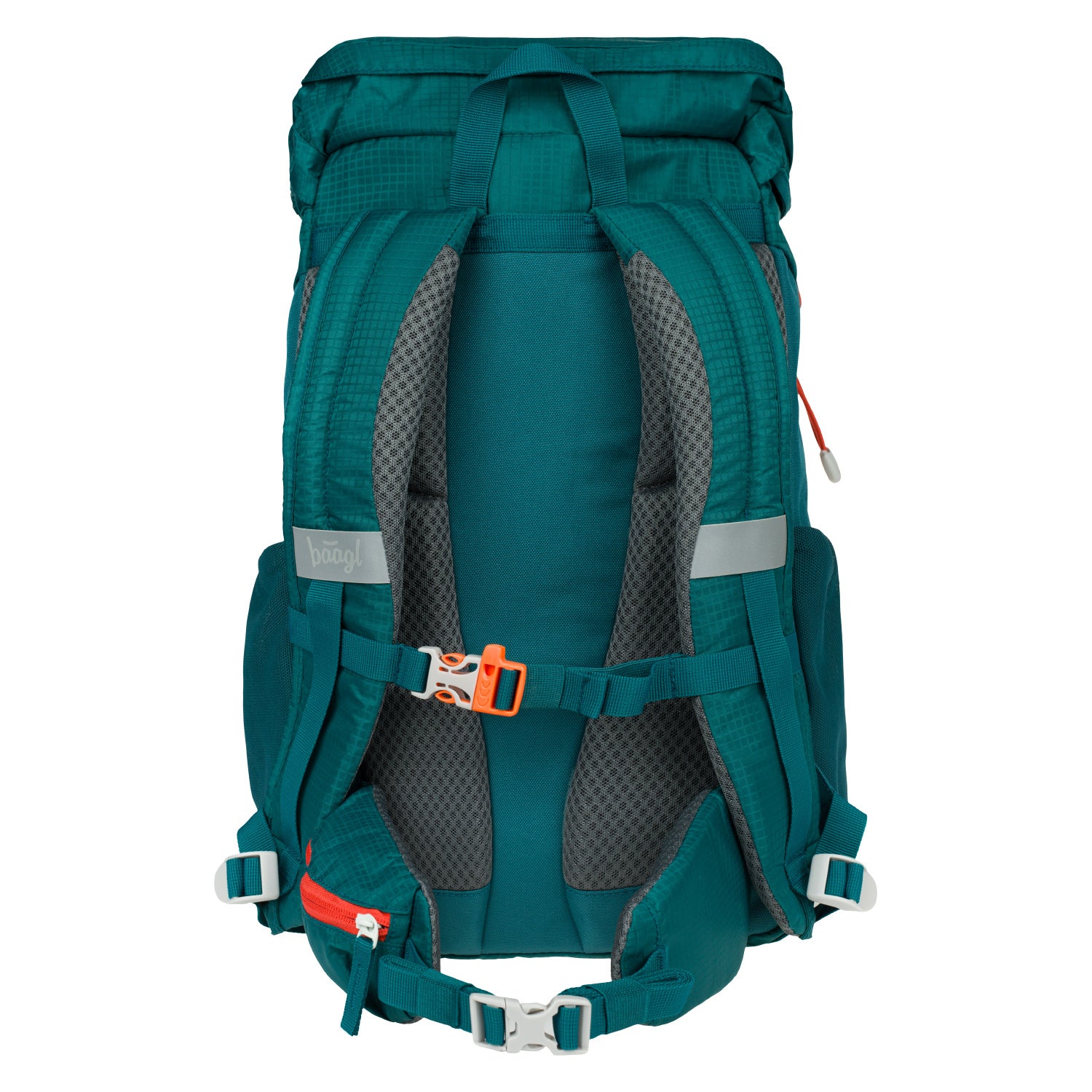 Zielony ergonomiczny plecak z logo BAAGL i pomarańczowymi paskami jest odpowiedni dla dzieci od 3. klasy szkoły podstawowej. Idealny towarzysz na wycieczki, wędrówki i do szkoły.