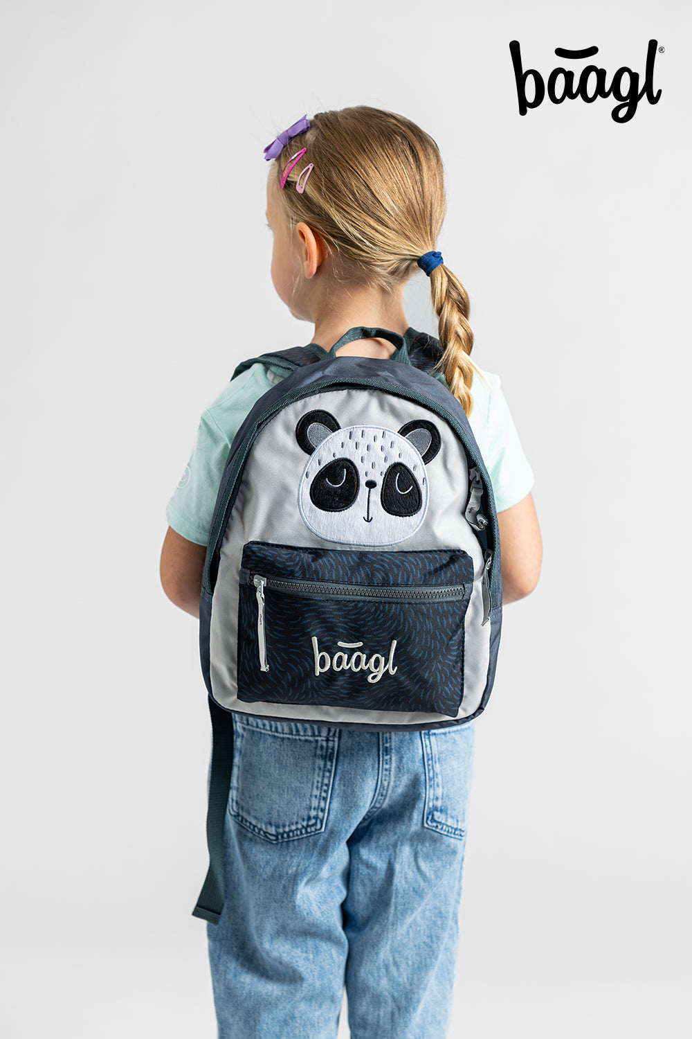 Plecak z ulubionym misiem pandą w odcieniach szarości, odpowiedni dla chłopców i dziewczynek, którzy chcą wybrać się na wycieczkę lub do przedszkola.