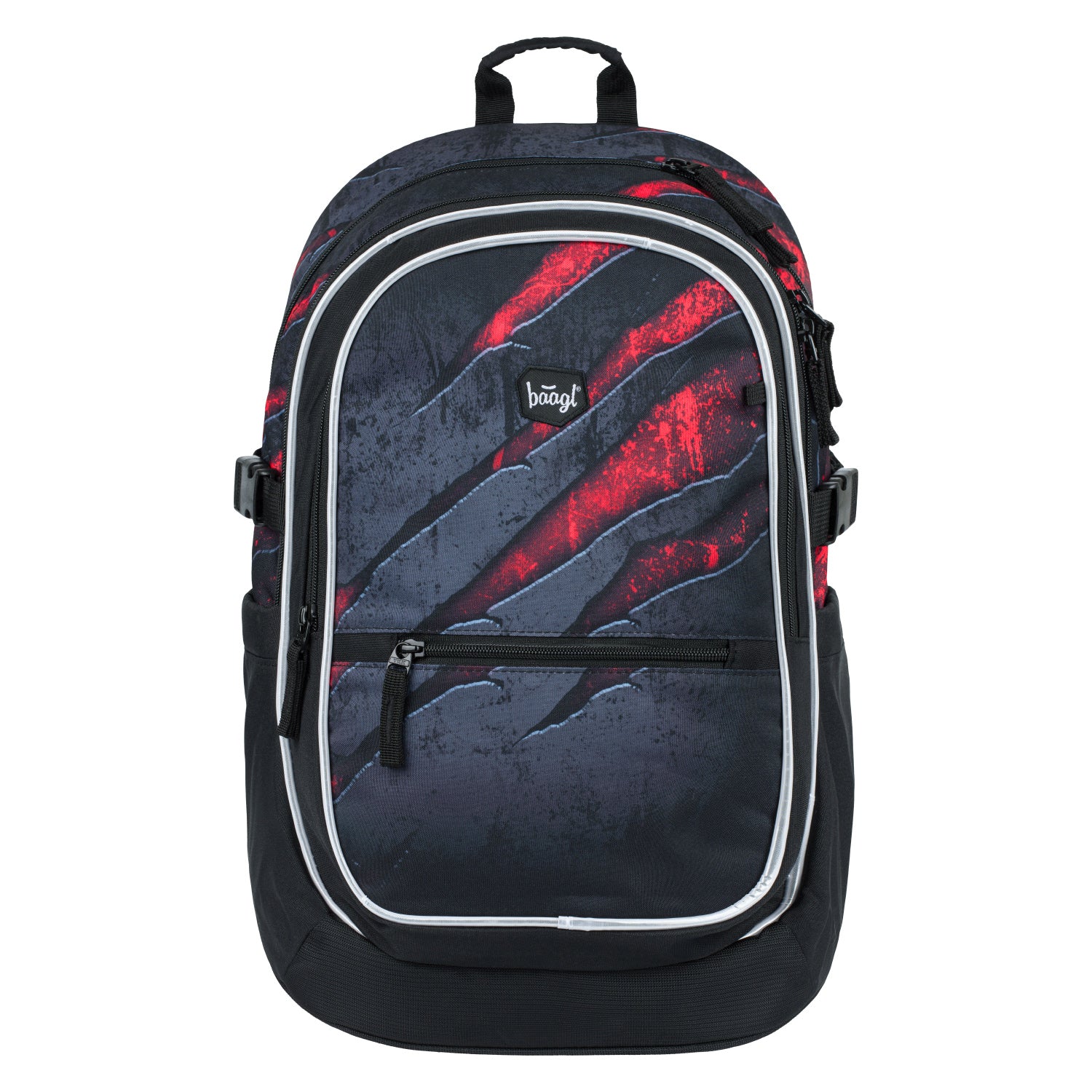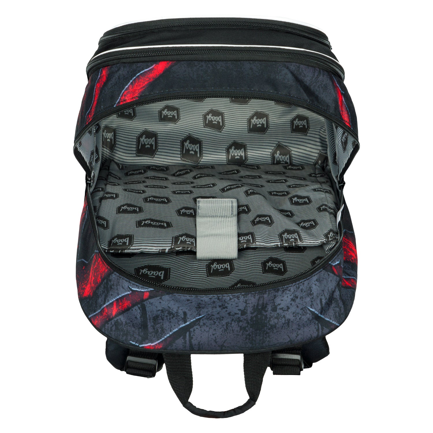 Plecak szkolny w ciemnej kolorystyce z wyraźnymi czerwonymi akcentami. Plecak jest odpowiedni od 3. klasy szkoły podstawowej.