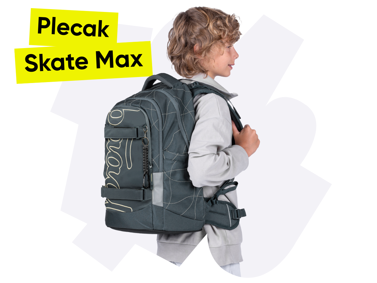 • Kompaktowy plecak Skate Max jest idealny dla uczniów i studentów o wzroście od 135 do 185 cm, co odpowiada mniej więcej trzeciej klasie szkoły podstawowej i wyżej.