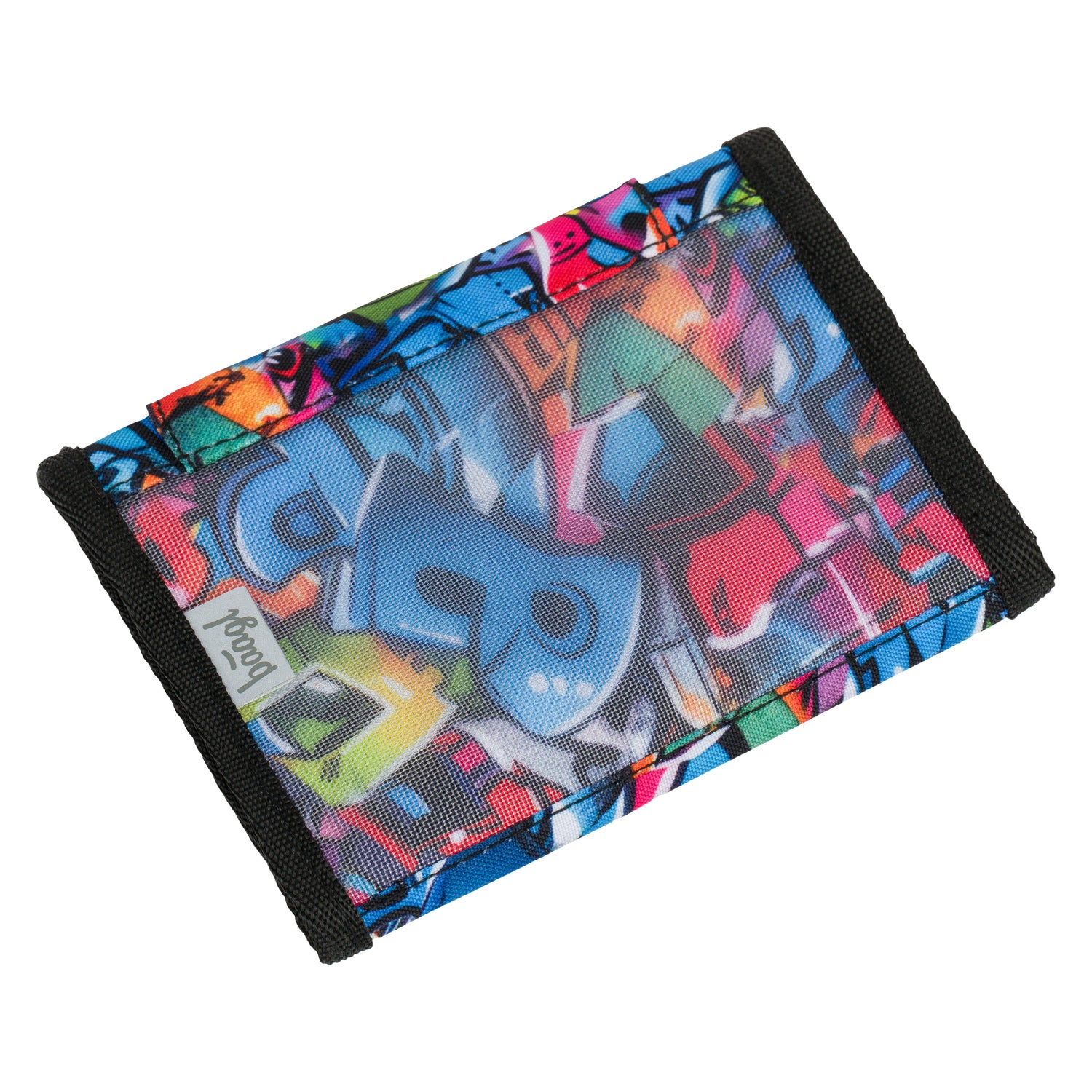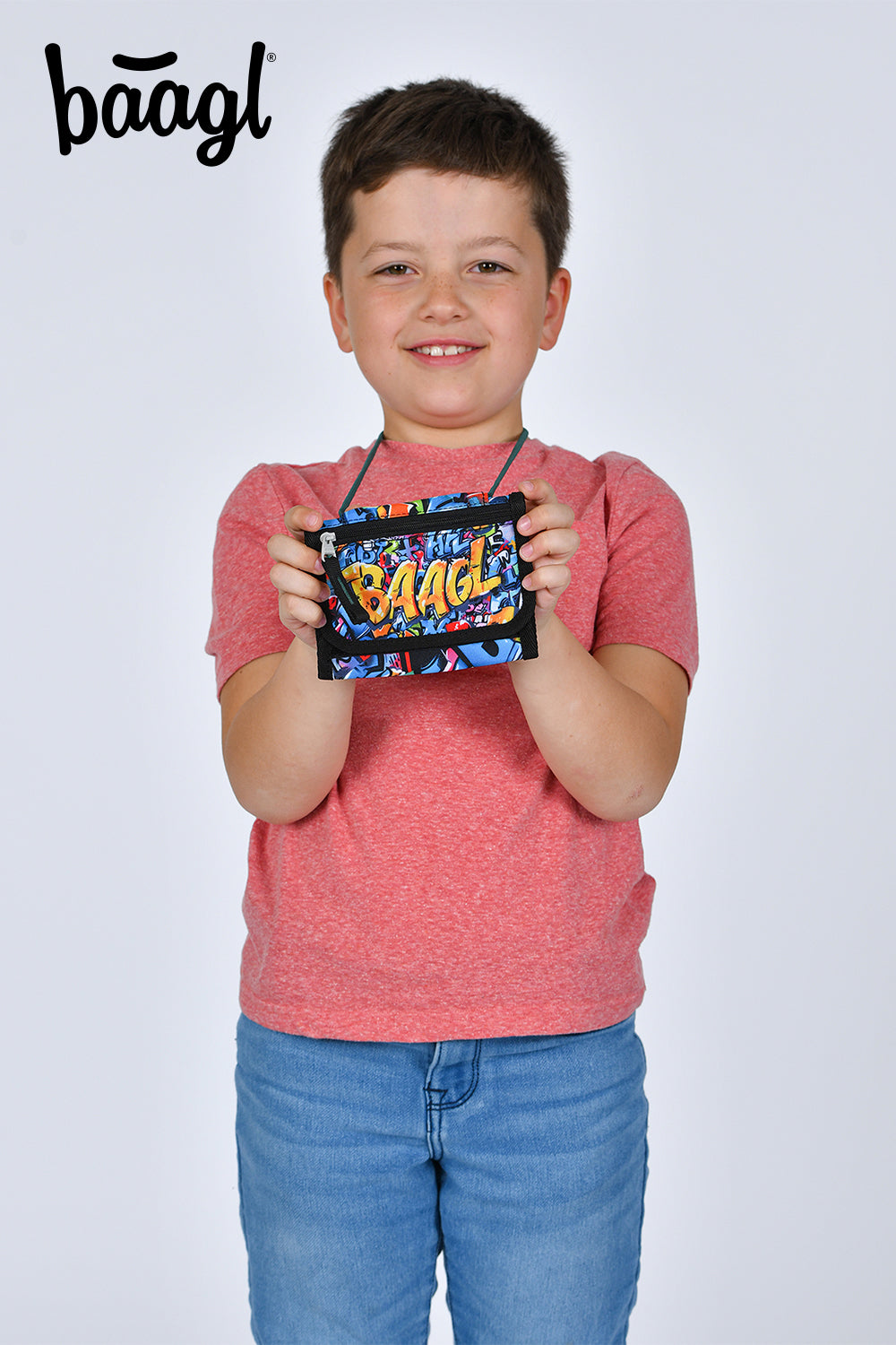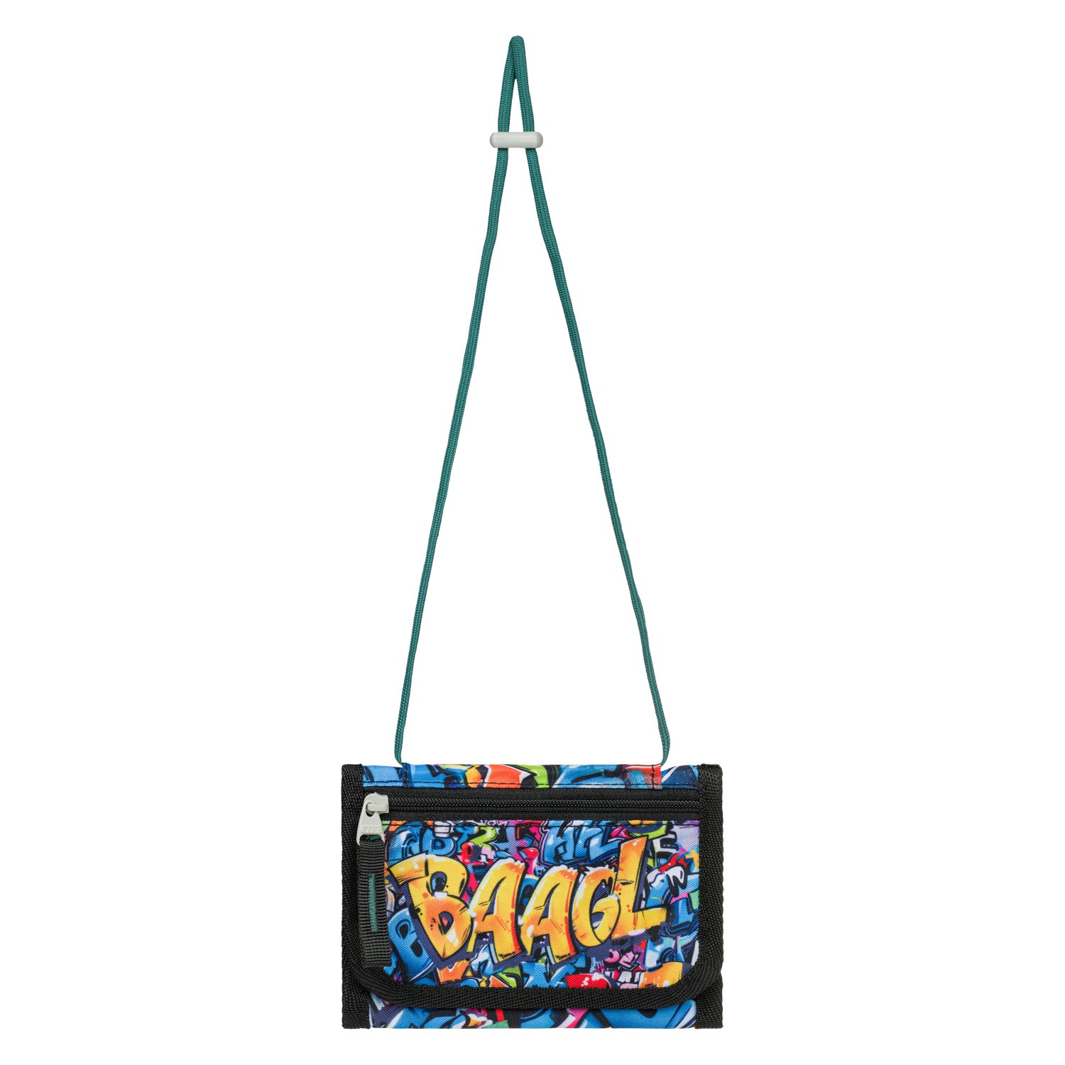 Praktyczny portfel z motywem skateparku i sznurkiem z zabezpieczeniem do wygodnego i bezpiecznego noszenia na szyi.