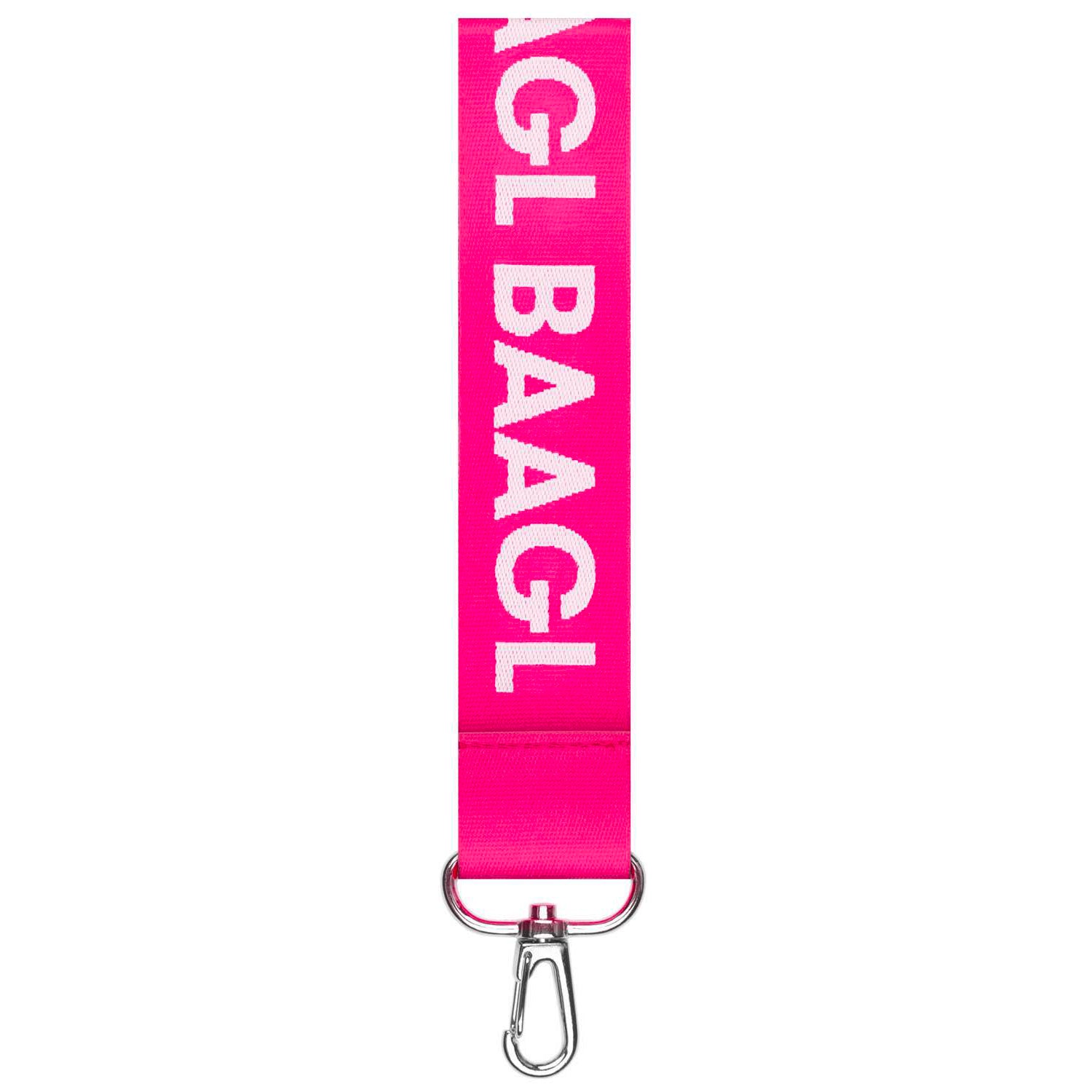 Tekstylny brelok na klucze z karabińczykiem w różowym kolorze.