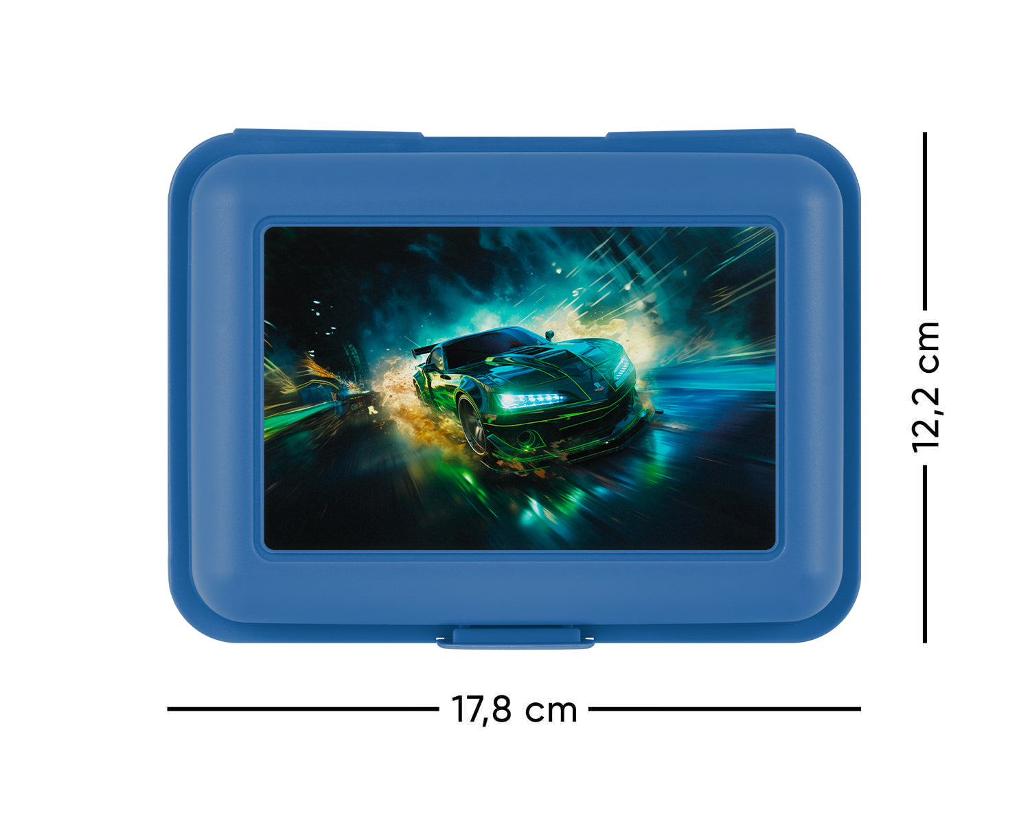 Praktyczny pojemnik na drugie śniadanie z motywem samochodu wyścigowego i regulowaną przegrodą do oddzielania jedzenia.