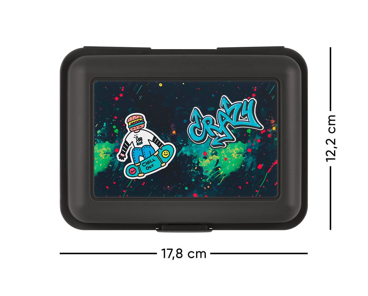Plastikowy pojemnik na drugie śniadanie z motywem skateboardowym i regulowaną przegrodą do łatwego oddzielania jedzenia.