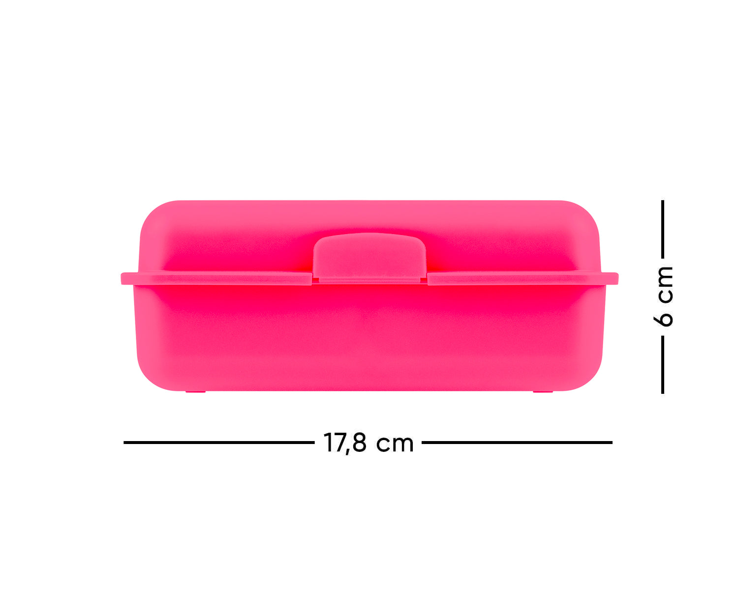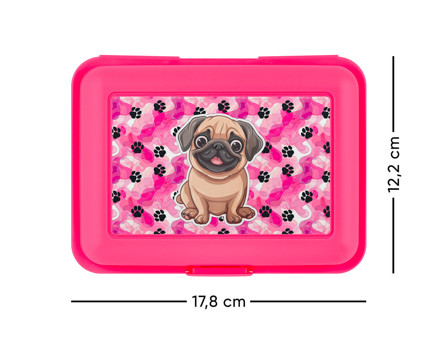 Różowy pojemnik na drugie śniadanie z motywem buldoga, wyposażony w regulowaną przegrodę do łatwego przygotowania różnorodnych i zrównoważonych posiłków.