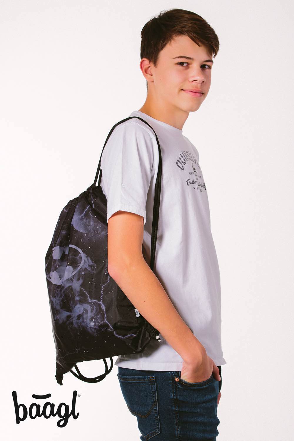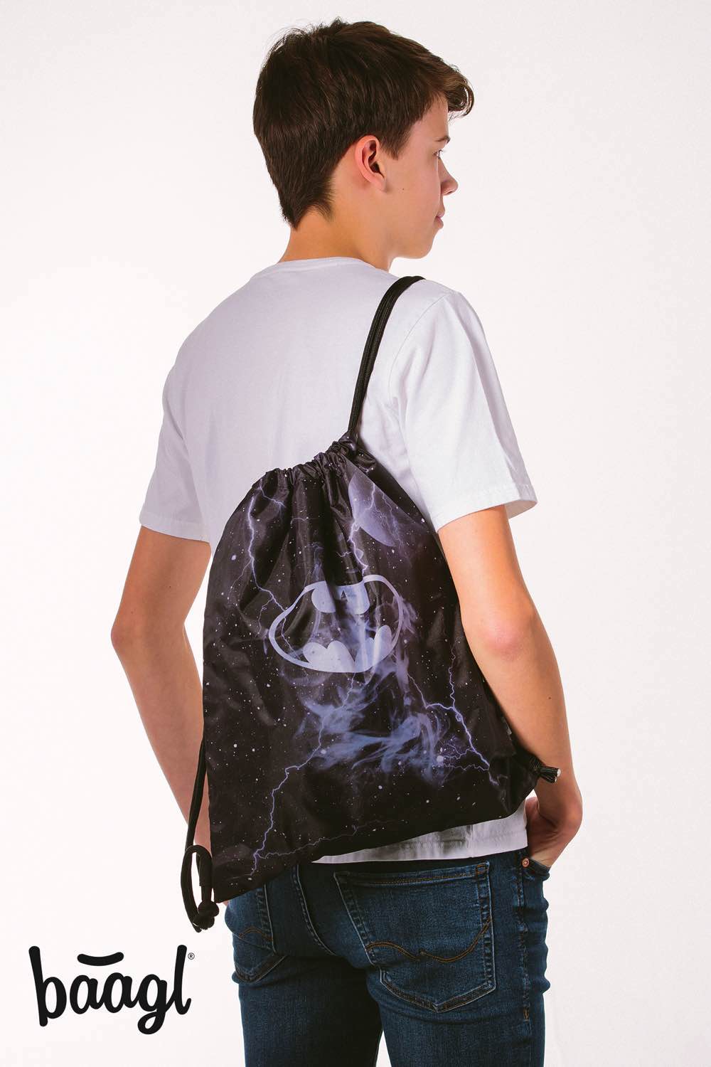 Worek na obuwie lub akcesoria gimnastyczne z ulubionym bohaterem Batmanem, wykonany z wytrzymałego wodoodpornego materiału z mocnymi sznurkami, co zapewnia wygodne noszenie na plecach.