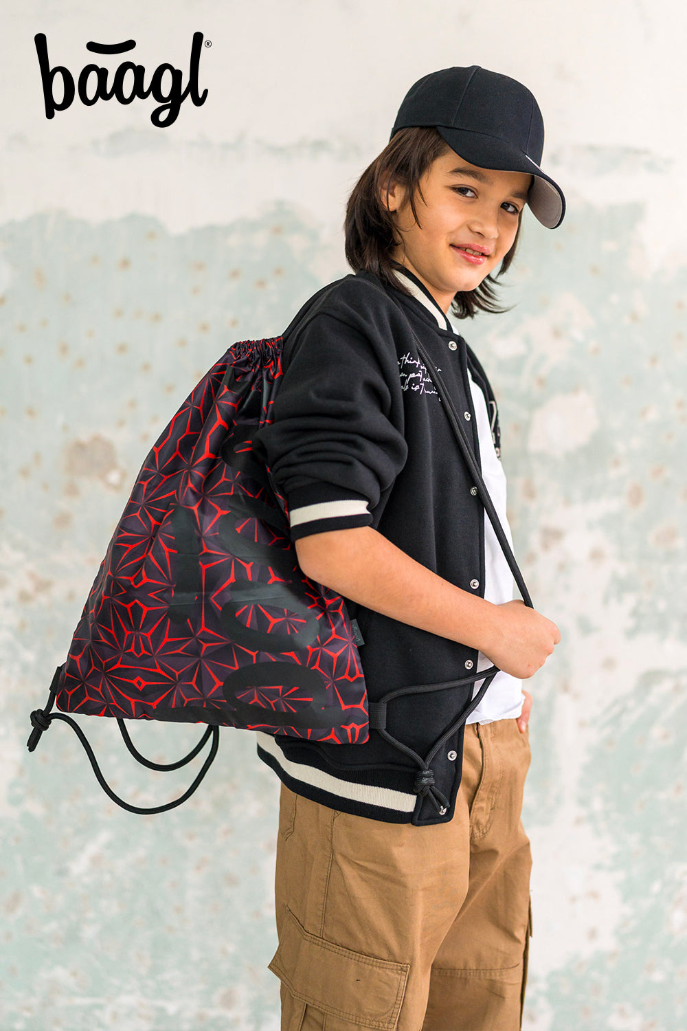 Praktyczny worek na obuwie lub na zajęcia wychowania fizycznego z geometrycznym motywem i logo BAAGL. Wykonany z materiału z recyklingu.