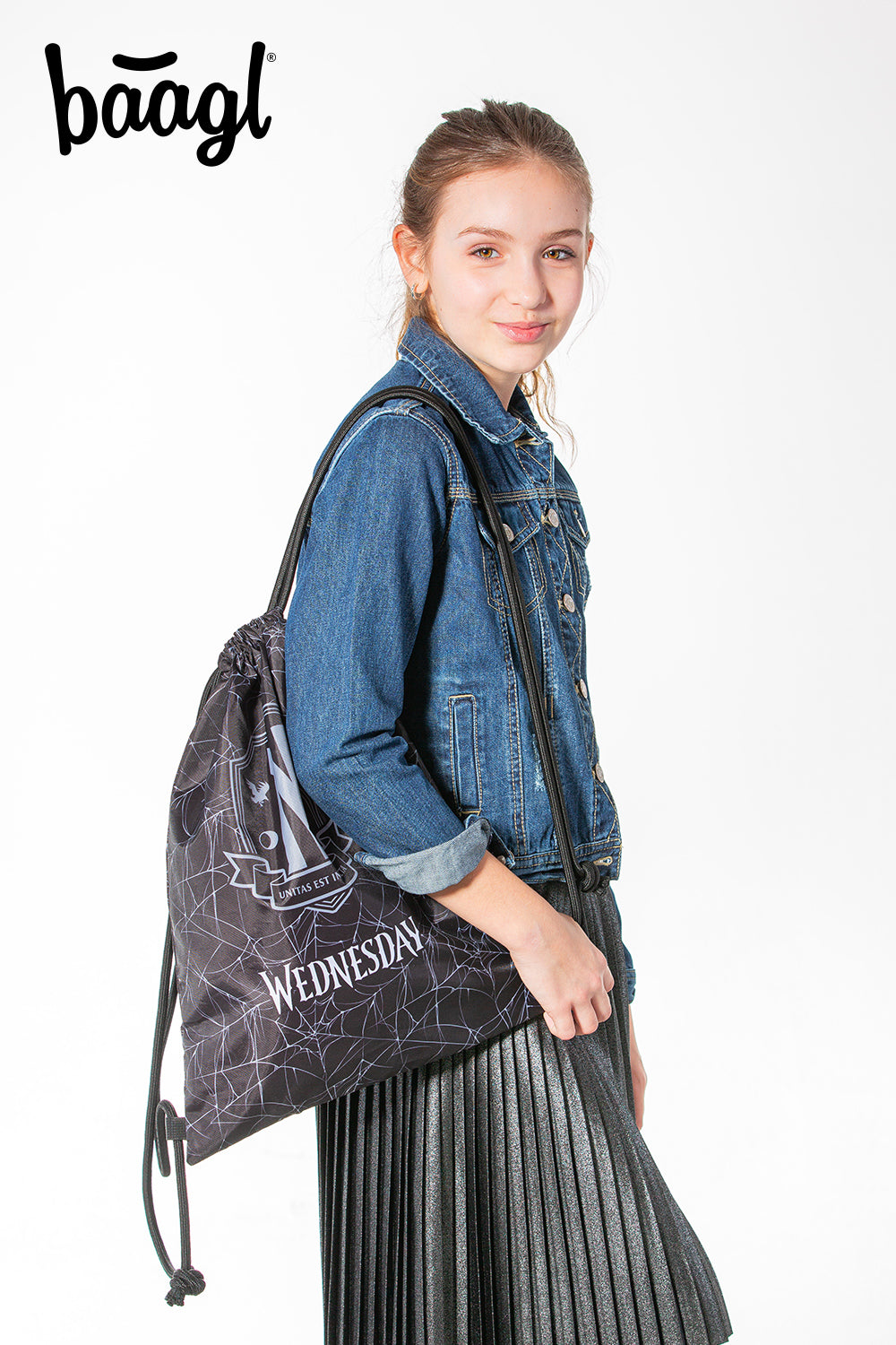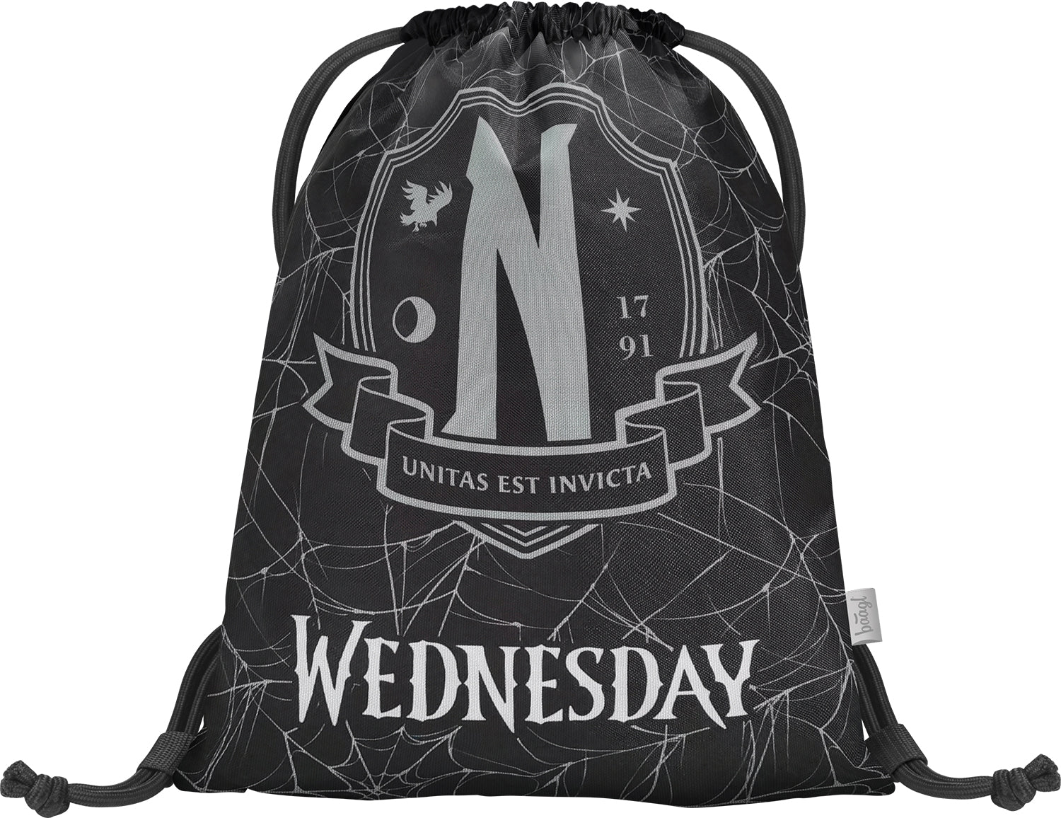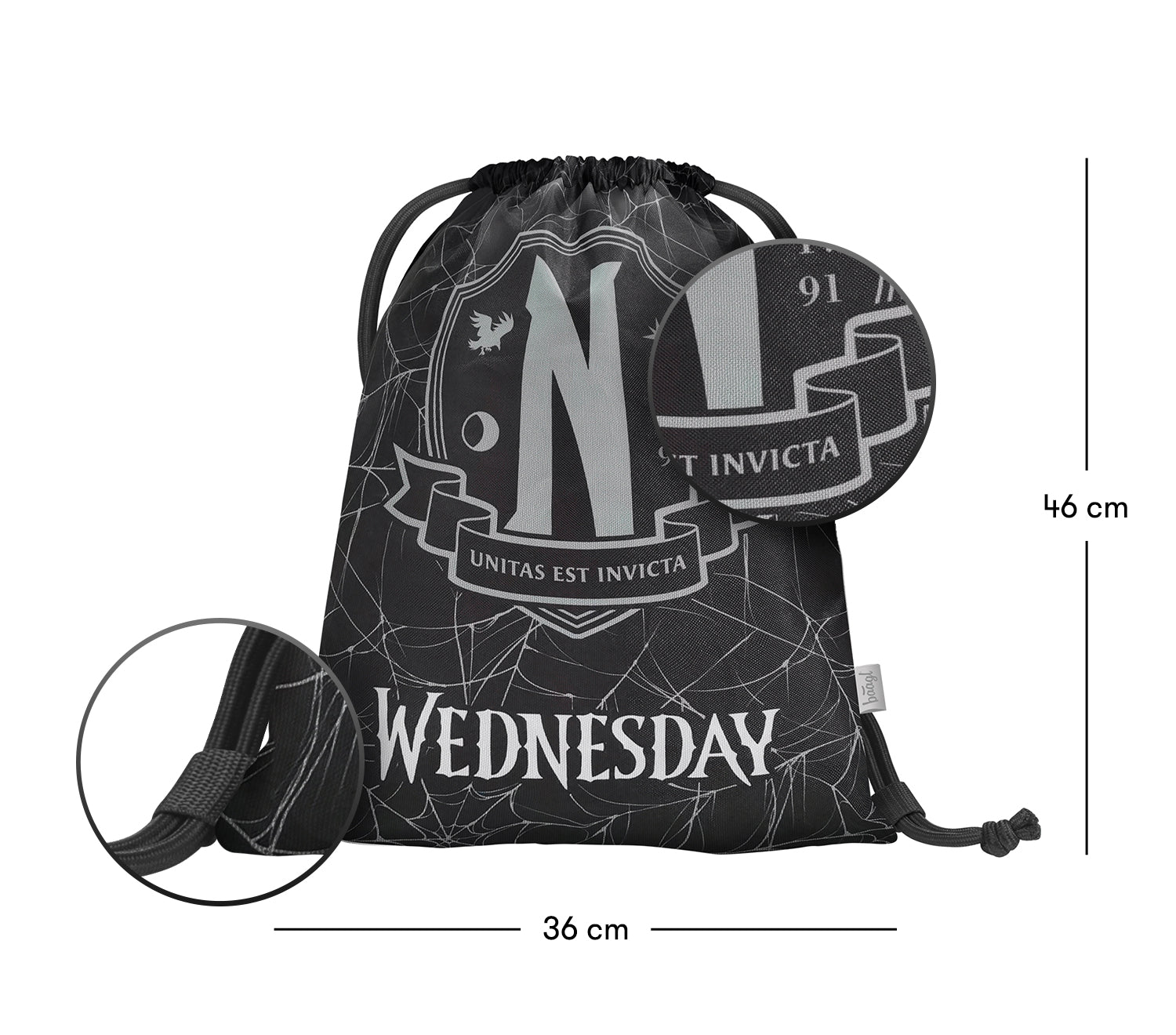 Praktyczny worek na obuwie lub na zajęcia wychowania fizycznego z unikatowym motywem popularnego amerykańskiego serialu "Wednesday".