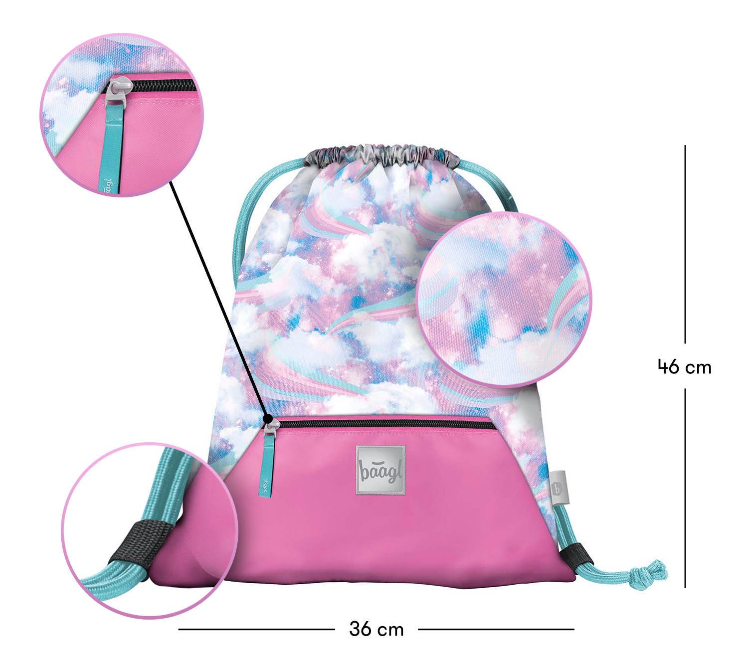 Dziewczęcy worek na obuwie lub na WF Niebo wykonany z wytrzymałego materiału wodoodpornego. Ma wzmocnione sznureczki do wygodnego noszenia na plecach i praktyczną kieszonkę na zamek.