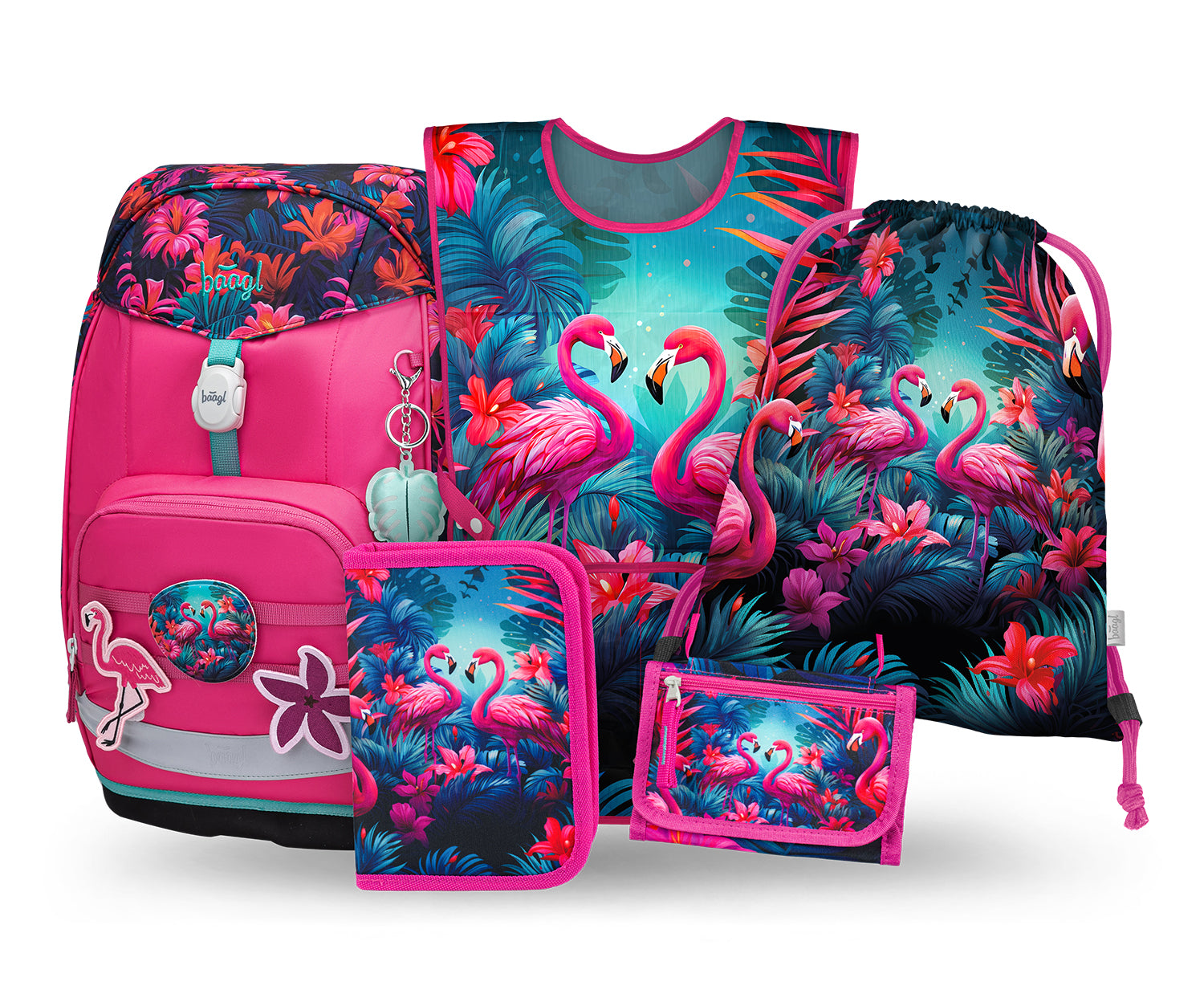 Kompletna wyprawka szkolna w designie z różowymi flamingami zawiera ultralekki plecak Airy Plus z wymiennymi naszywkami, klasyczny piórnik, worek z możliwością przypięcia do plecaka, fartuszek na zajęcia plastyczne oraz praktyczny portfel — wszystko w atrakcyjnej cenie.