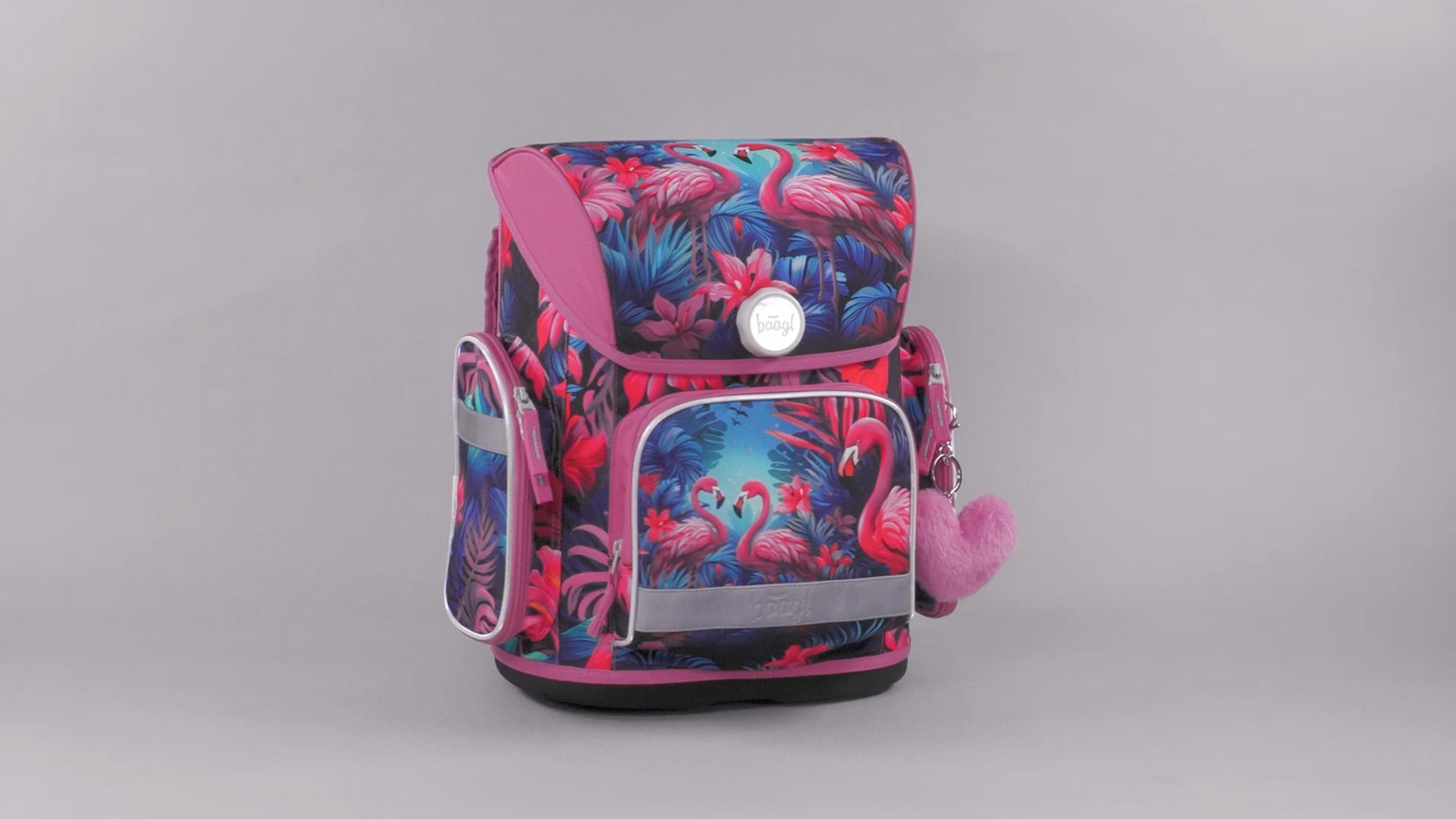 Niedrogi szkolny zestaw zawierający różowy tornister ERGO TLAPKY z wymiennymi naszywkami, piórnik z dwiema klapkami, worek na obuwie, fartuszek na plastykę oraz praktyczny portfelik.