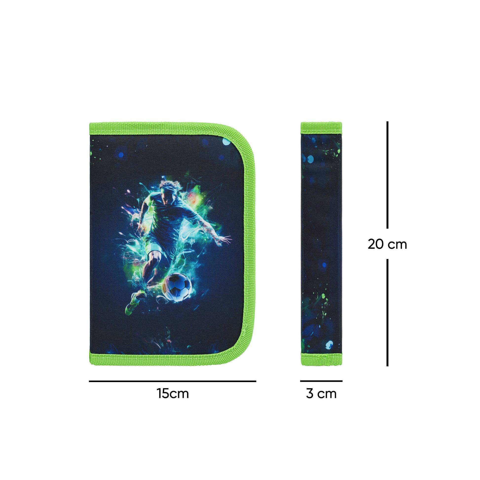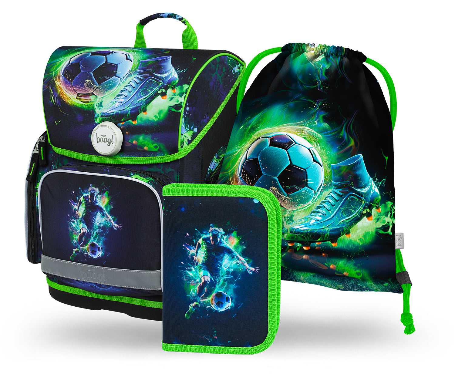 Niedrogi zestaw szkolny zawierający tornister Ergo, piórnik i worek na obuwie z motywem piłkarza.