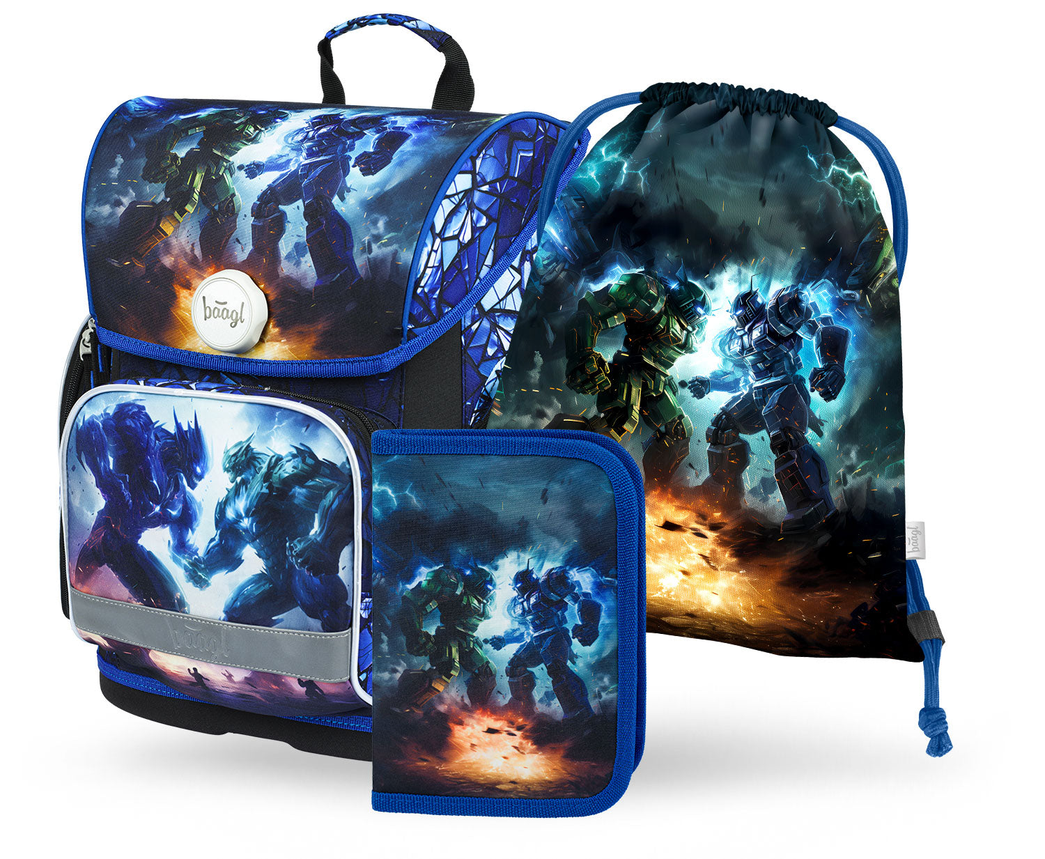 Zestaw szkolny, który obejmuje ergonomiczną torbę Ergo Roboti z motywami inspirowanymi światem gier komputerowych, piórnik i worek na WF.