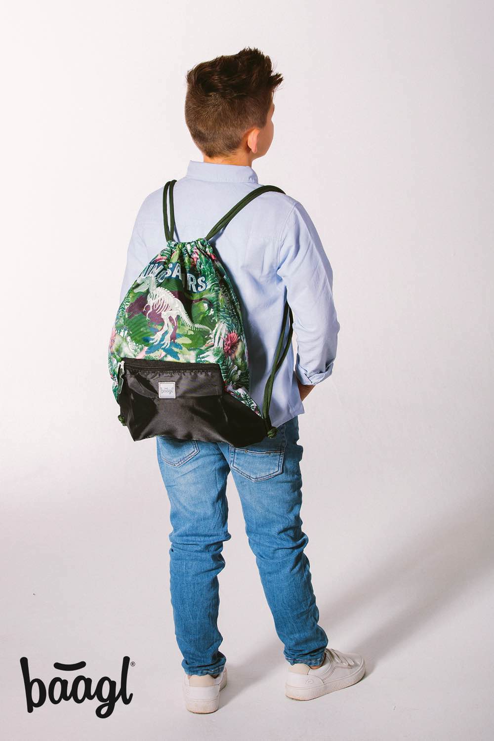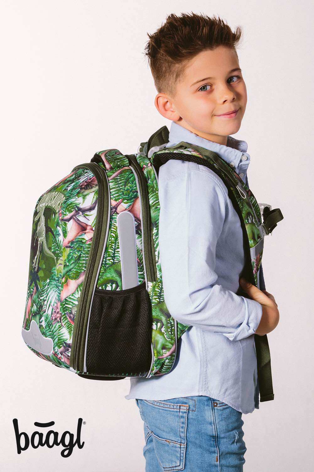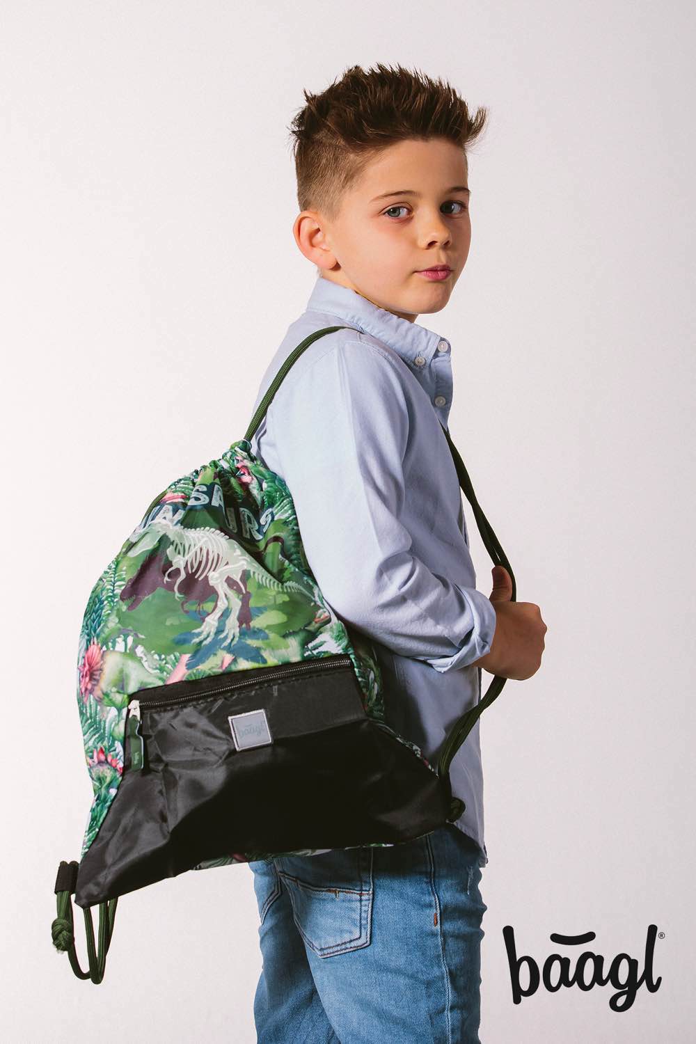 Zielony zestaw szkolny Shelly Dinozaur składający się z tornistra, piórnika dwukomorowego i praktycznego worka na obuwie.