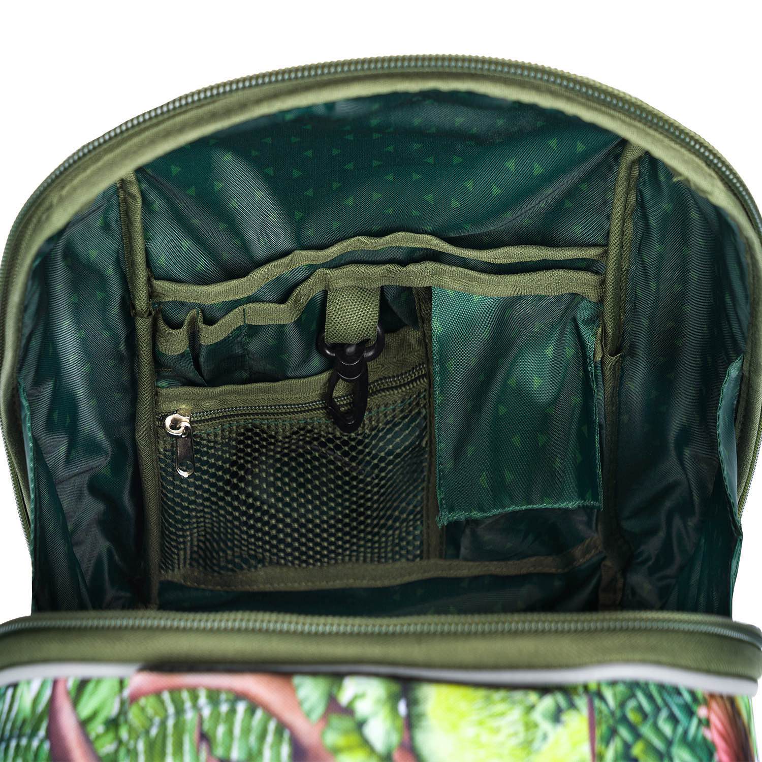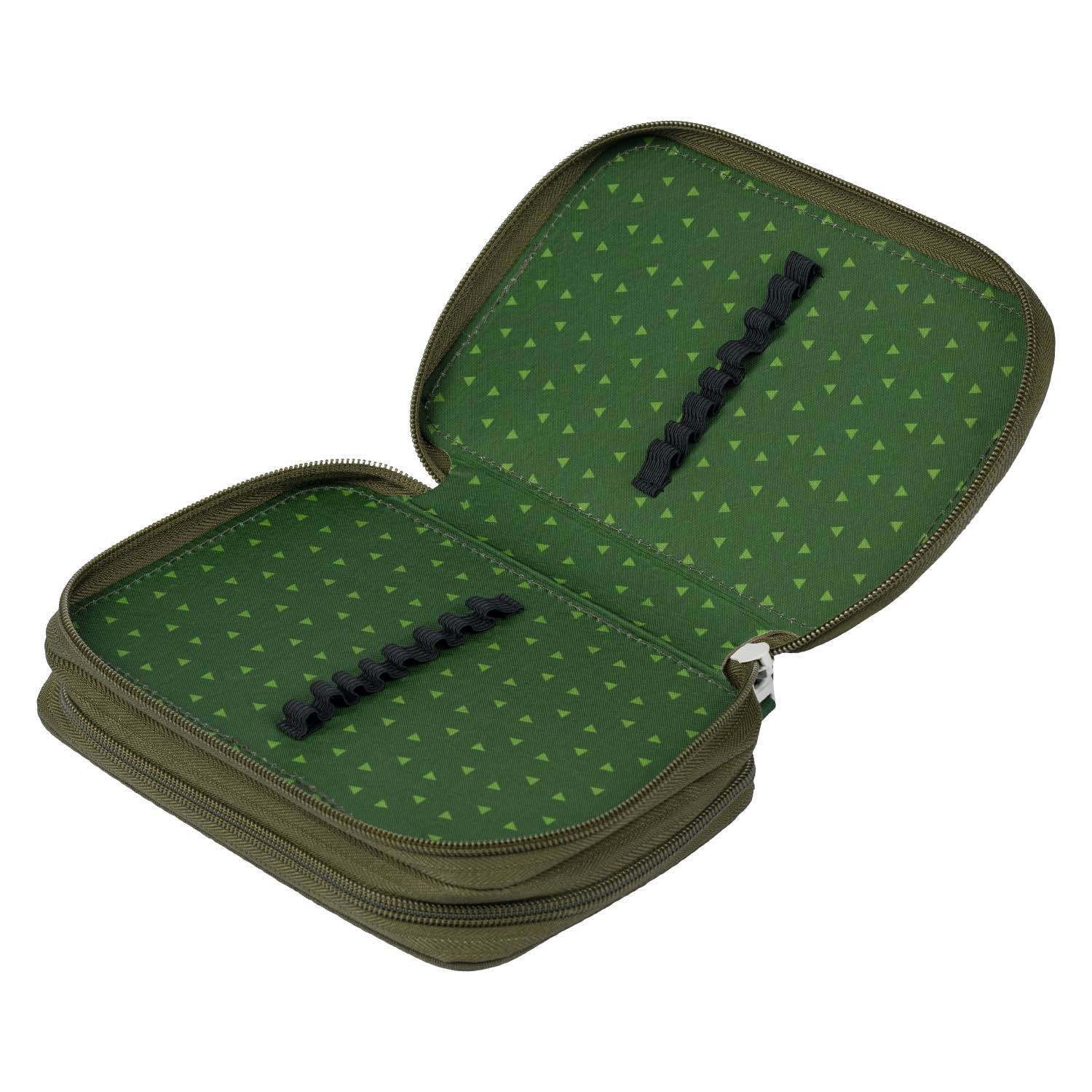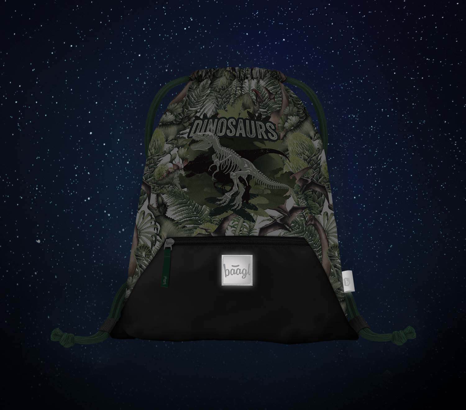 Zielony zestaw szkolny Shelly Dinozaur składający się z tornistra, piórnika dwukomorowego i praktycznego worka na obuwie.