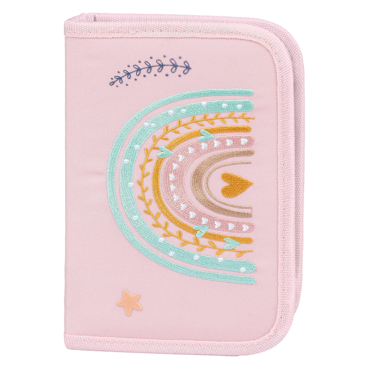 Niedrogi zestaw szkolny zawierający ergonomiczny tornister Zippy, piórnik i worek na obuwie z haftem tęczy.